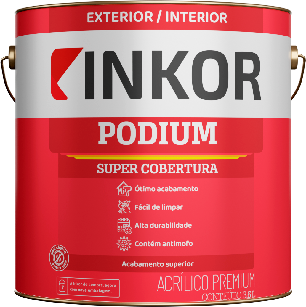 Tinta Podium Fosco é uma tinta de alta performance, com fácil aplicação, baixo respingo, ótima cobertura e resistência às intempéries. Possui alta opacidade, garantindo excelente acabamento e disfarce de imperfeições, com acabamento fosco uniforme.